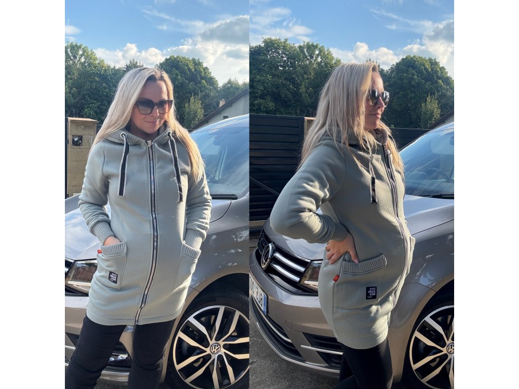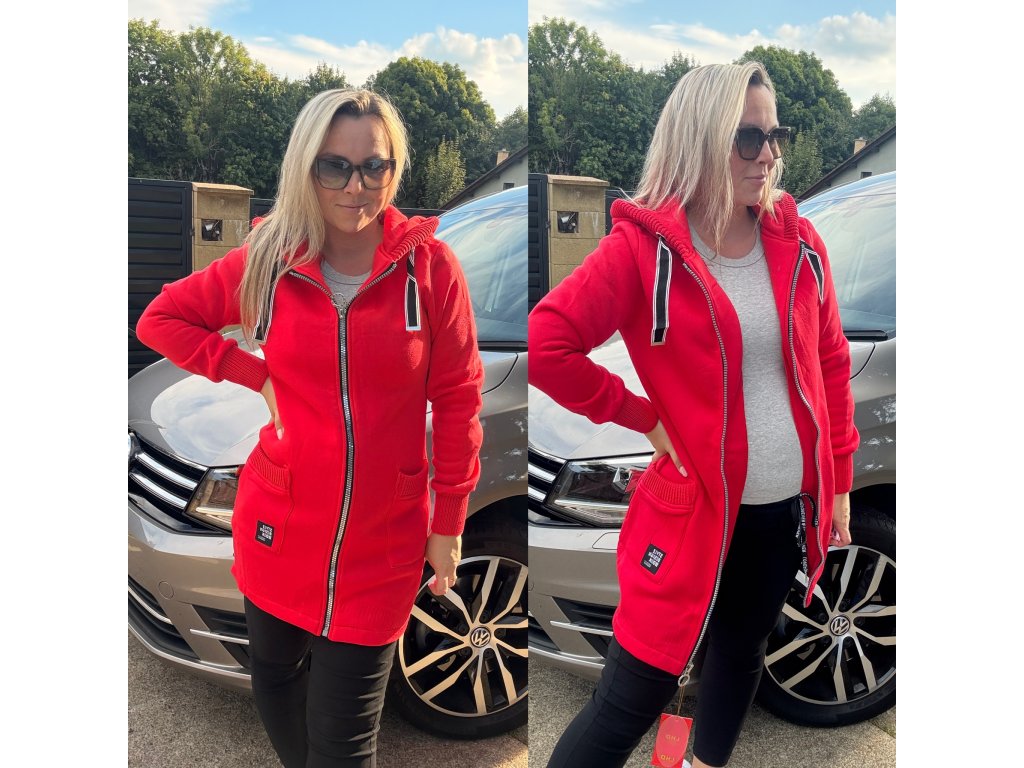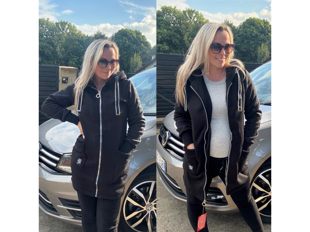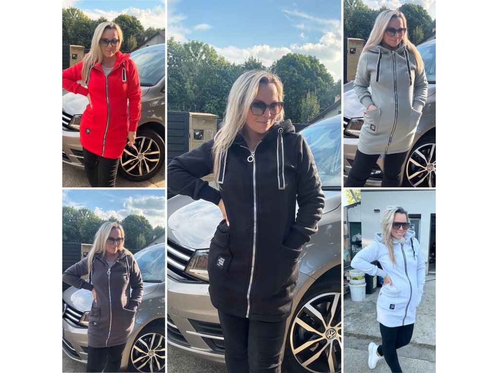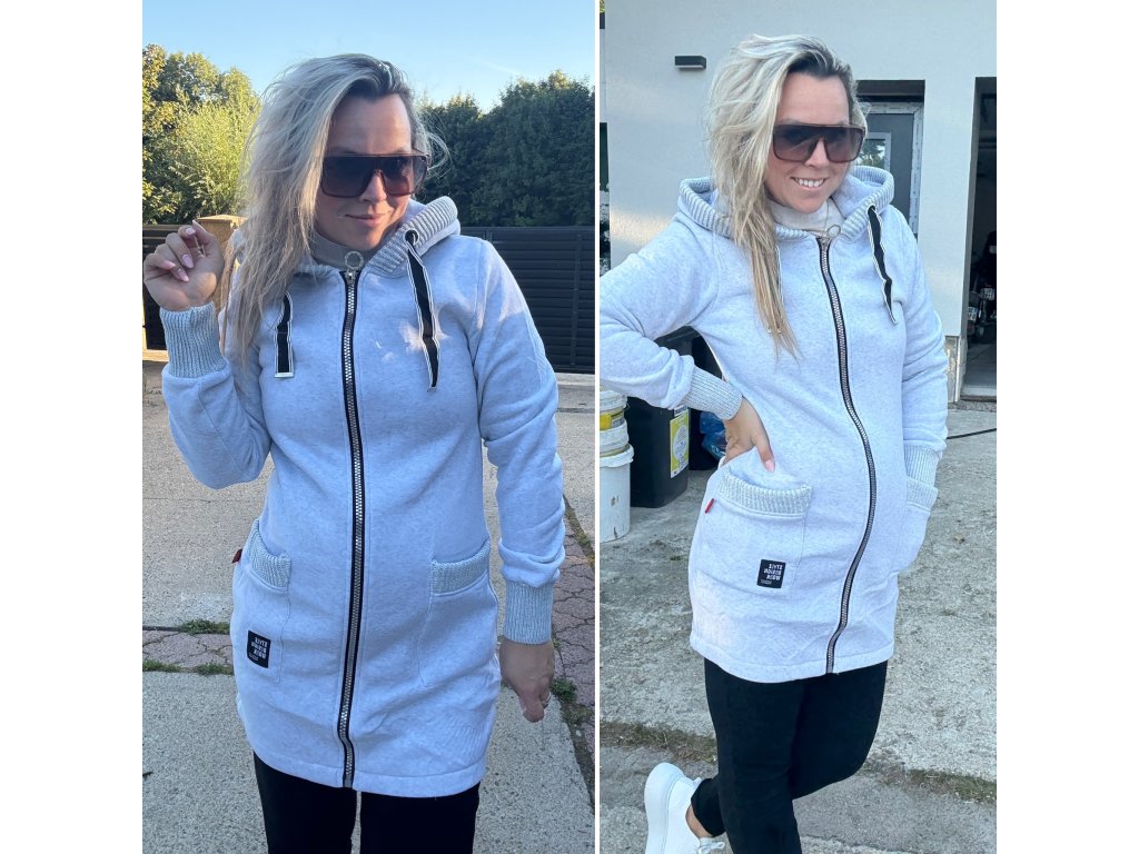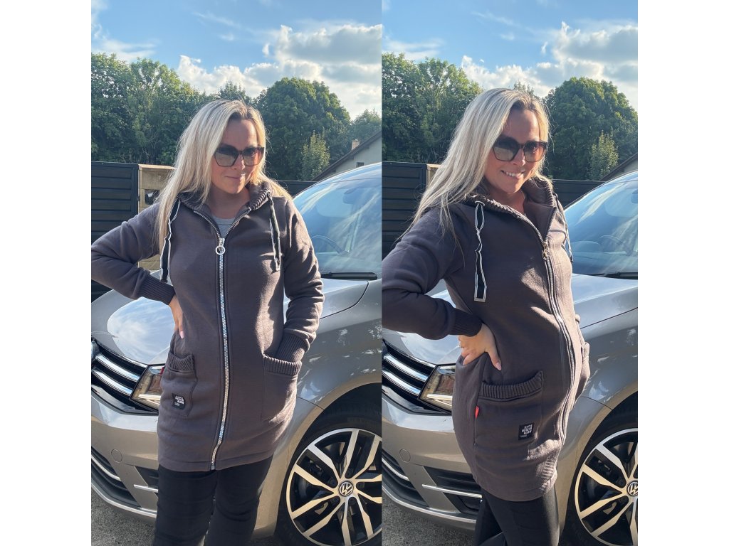 Prodloužený střih skvěle padne, má praktickou kapuci s ozdobným pleteným lemem, stejně jako pletené manžety na rukávu a kapsách.