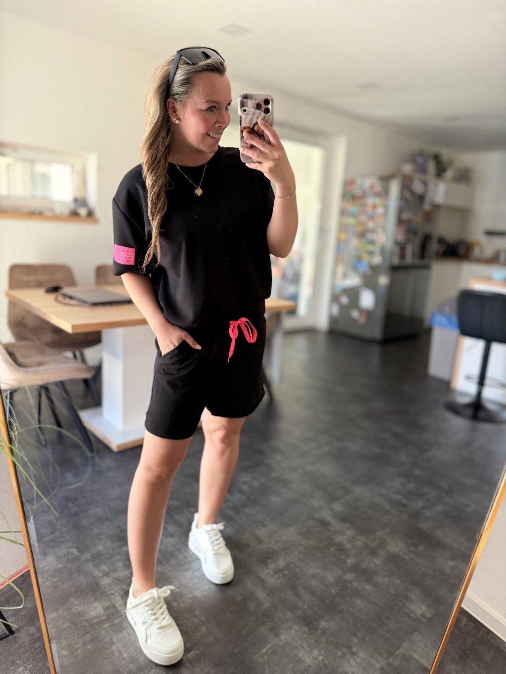Volnější střih trička a kraťasy s pružným pasem, který se dá stáhnout tkaničkou, zaručují, že se budete cítit skvěle po celý den.