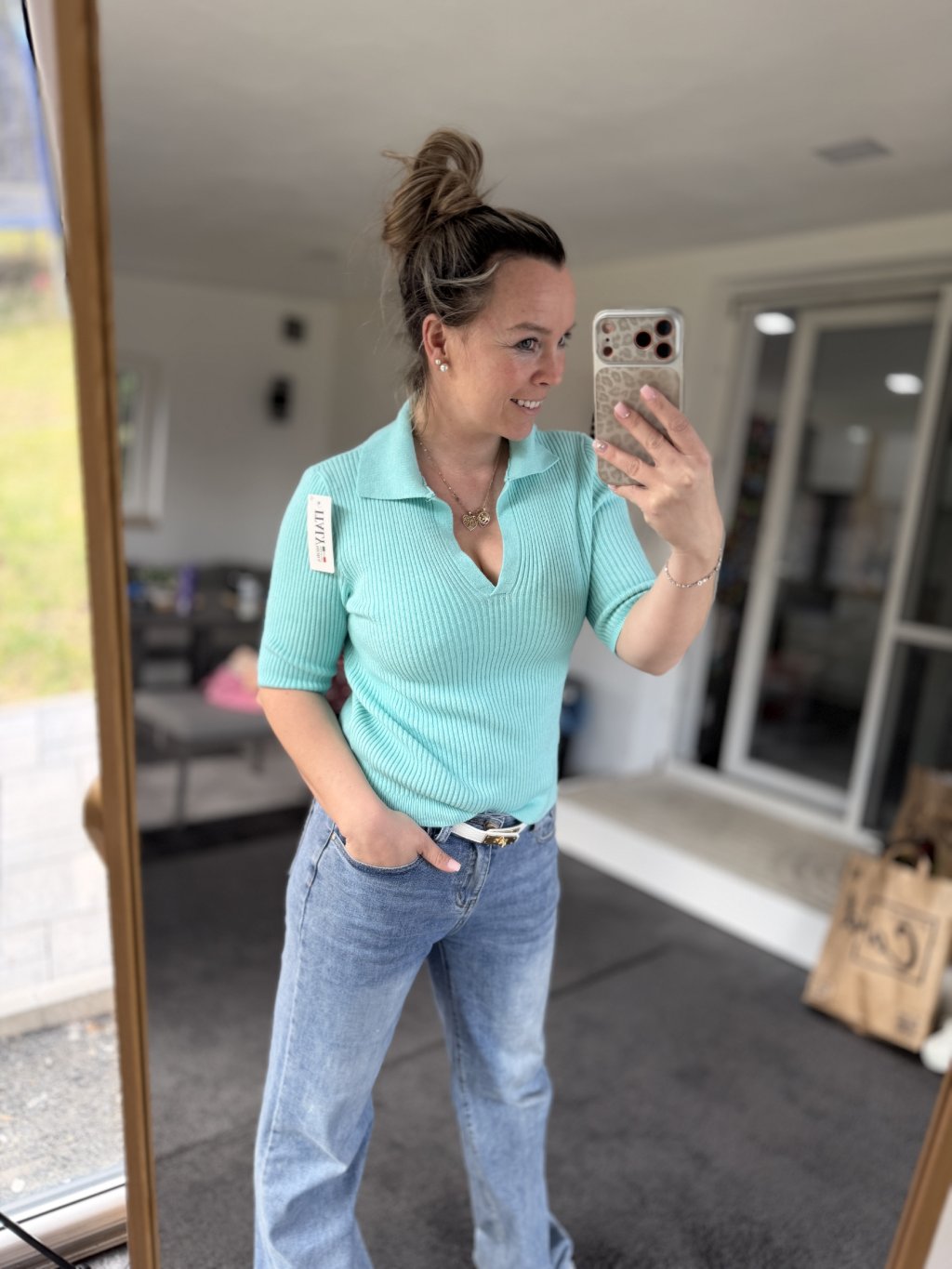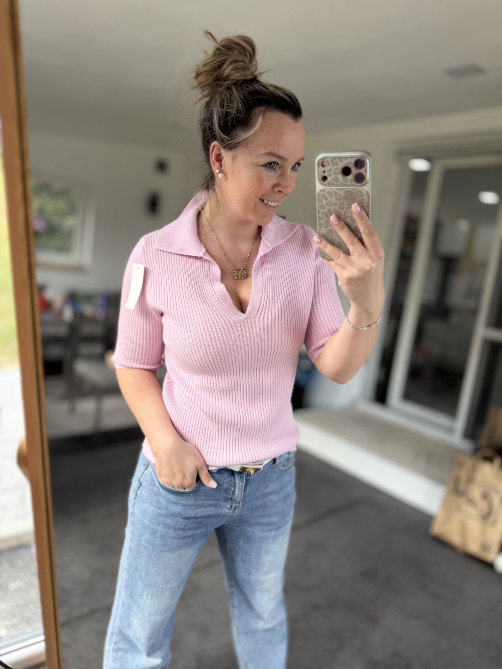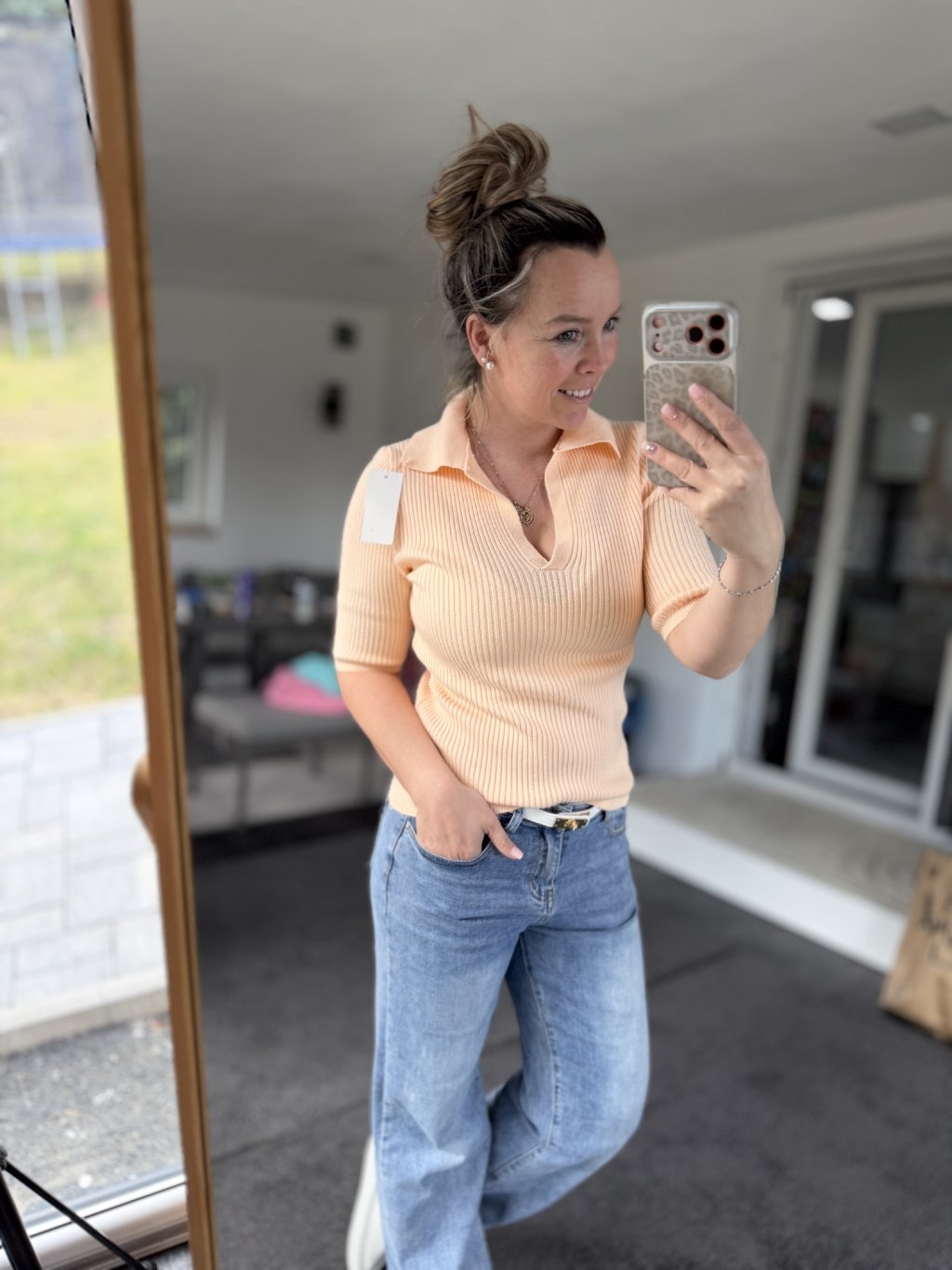 Elegantní žebrované triko ze svetrového materiálu s límečkem a výstřihem do V.