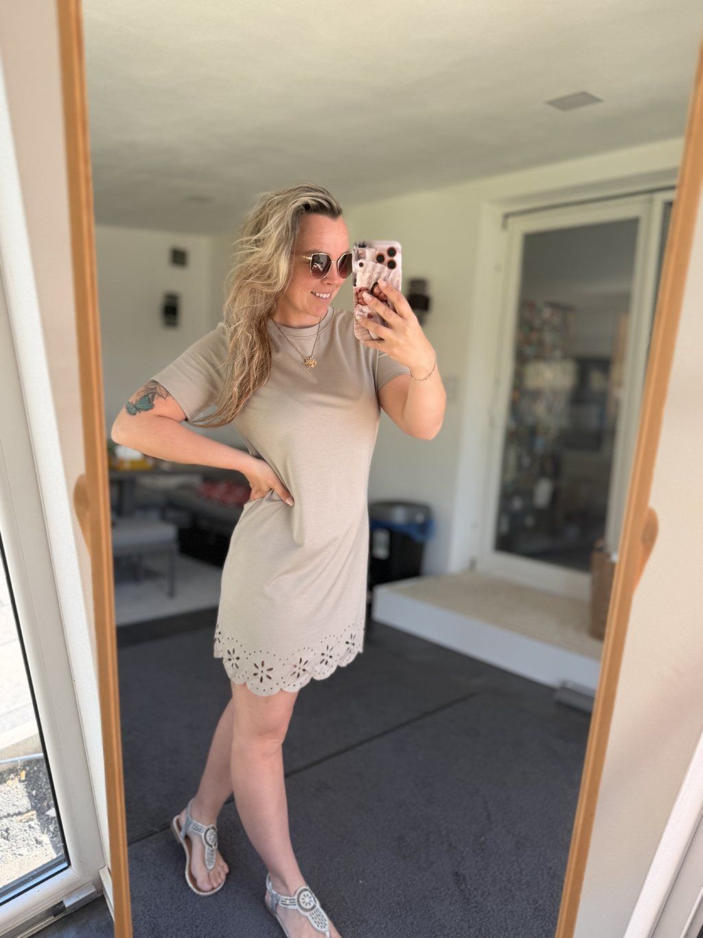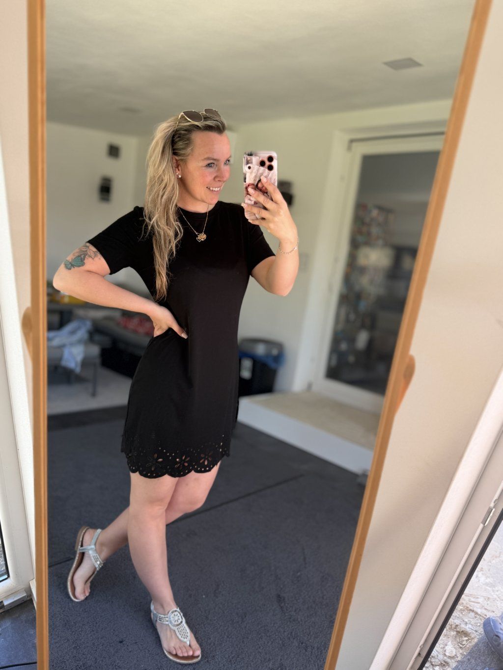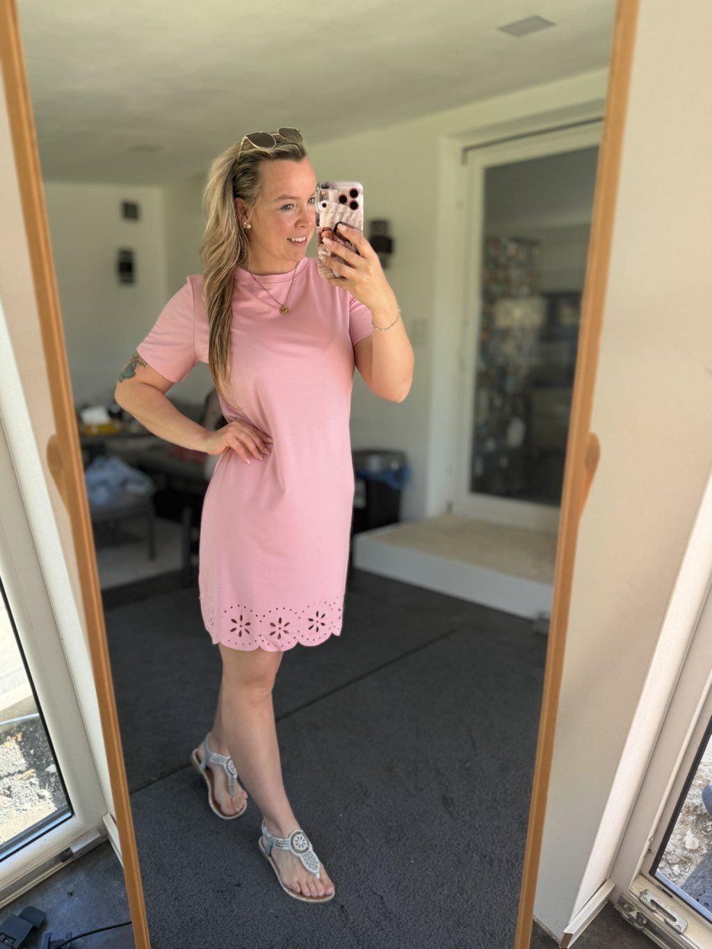Šaty mají klasický střih, mírně uvolnění T-shirt s krátkým rukávem a kulatým výstřihem. Spodní část má ozdobné děrování.