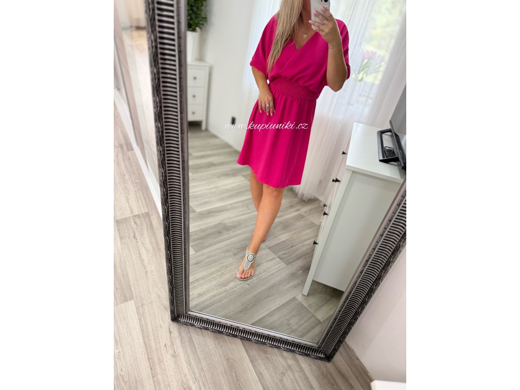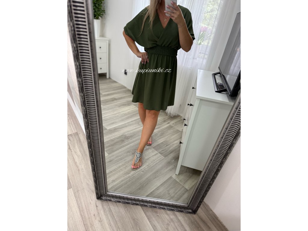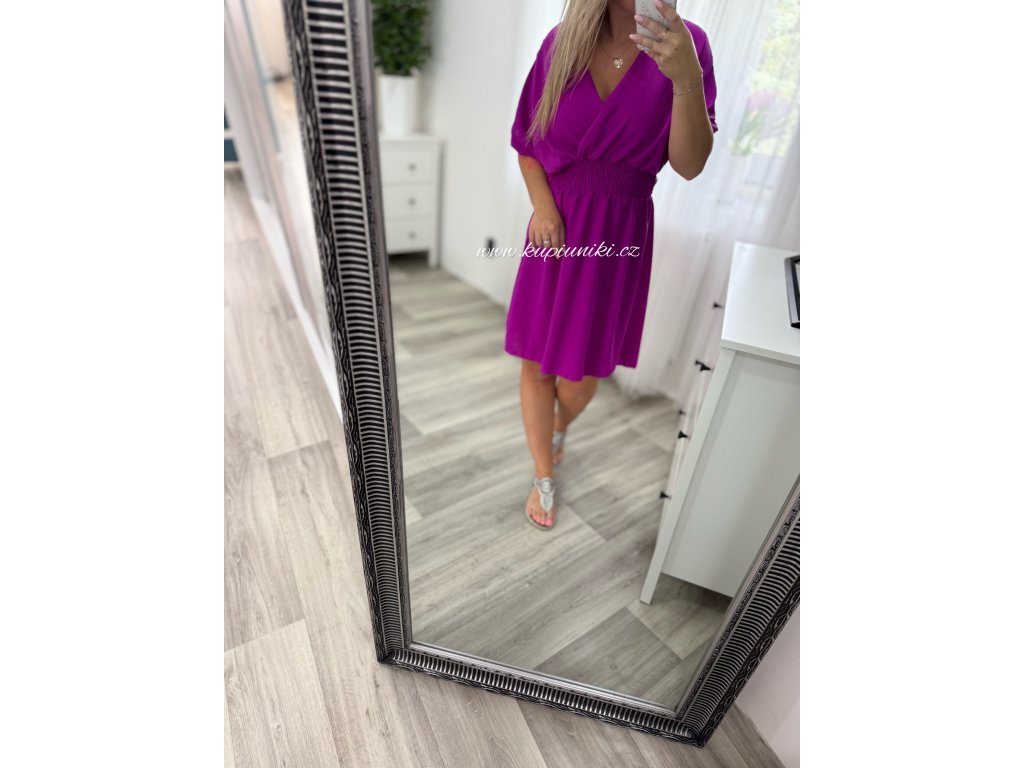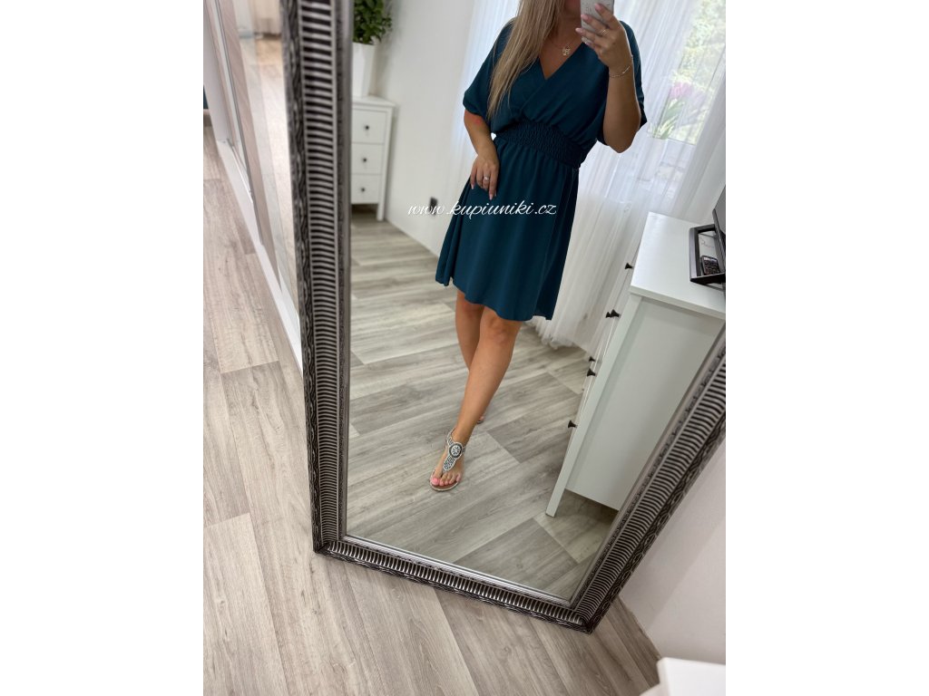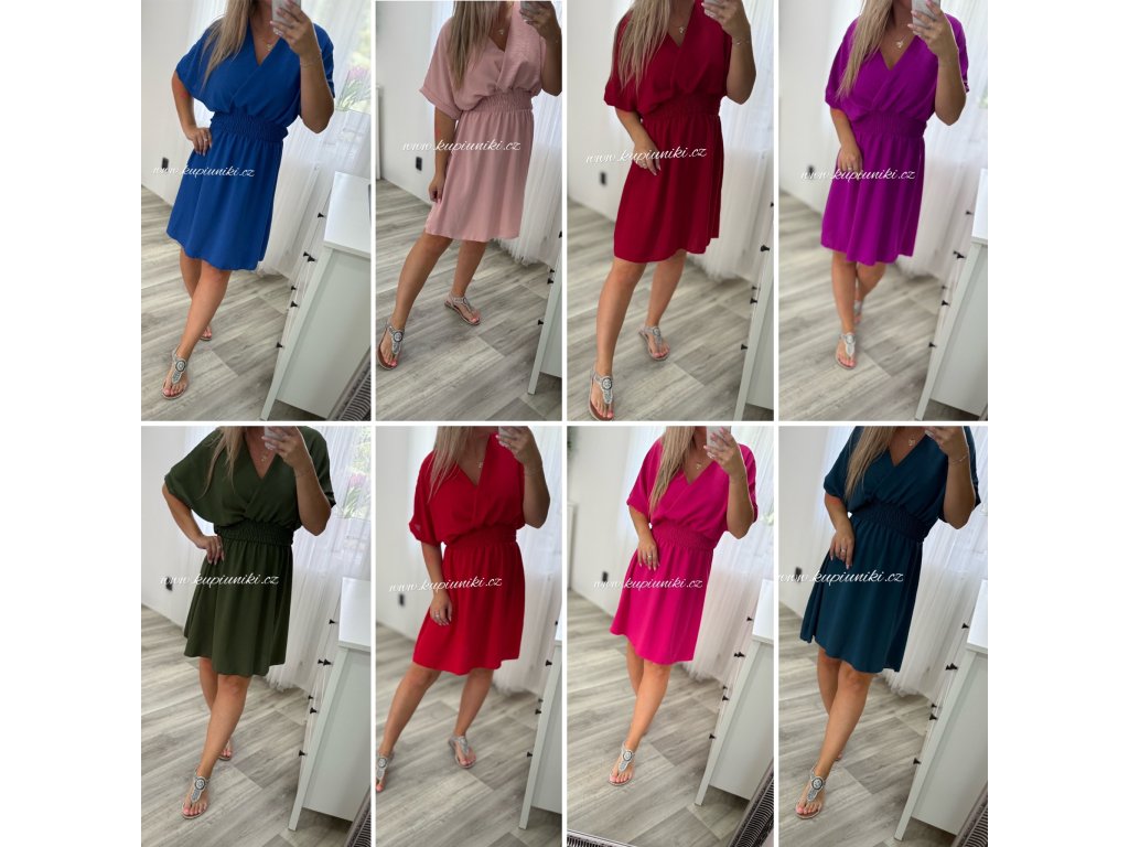 Pohodlné šaty s překládaným výstřihem, volnými rukávy a pružným pasem krásně kopírují siluetu.