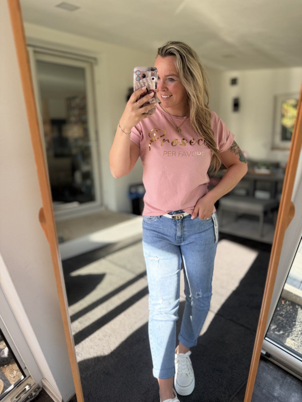 Klasický kulatý výstřih a krátké ohrnuté rukávy vytvářejí uvolněný, moderní look, který sluší každé ženě.